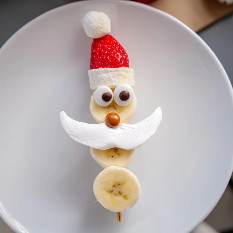Save Festive and fun fruit skewers featuring bananas, strawberries, and marshmallows, perfect for holiday gatherings or a healthy kid-friendly treat.