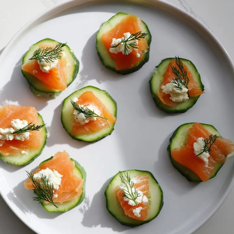 - Arrange the smoked salmon on cucumber slices& top with a dab of goat cheese and dill.