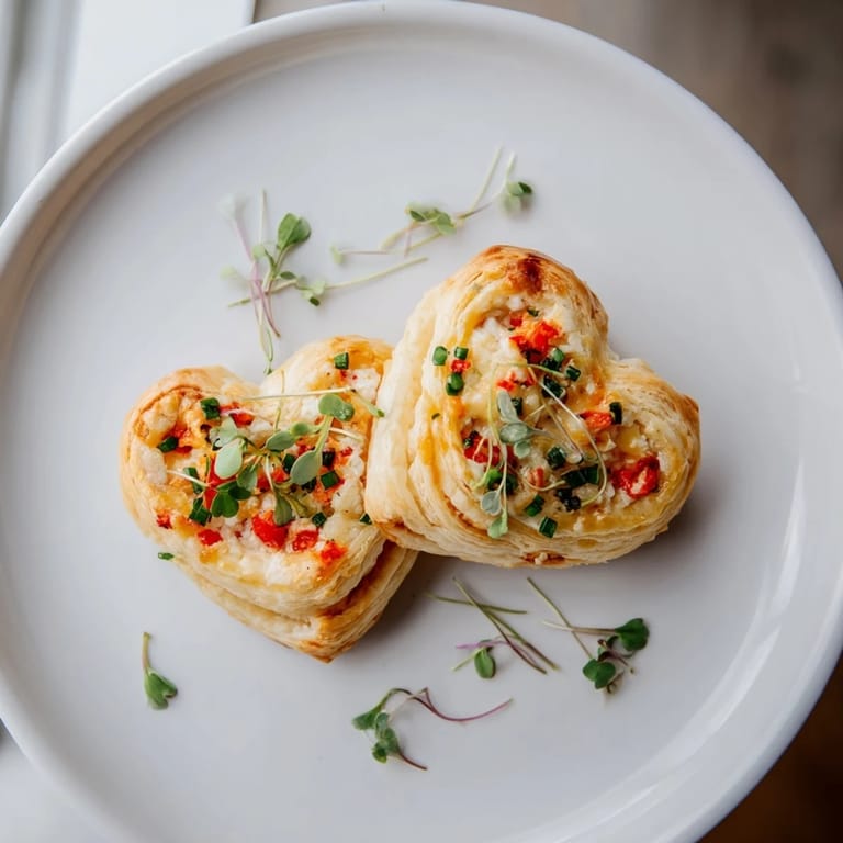 Save A romantic and elegant appetizer featuring crisp puff pastry hearts intertwined and filled with creamy goat cheese, sweet roasted peppers, and fresh herbs—perfect for sharing with your loved one.