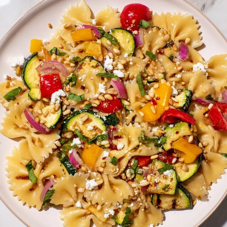 Save A vibrant and colorful pasta dish featuring bow tie pasta tossed with roasted vegetables, fresh herbs, and a zesty lemon-garlic dressing—perfect for celebrations or special gatherings.