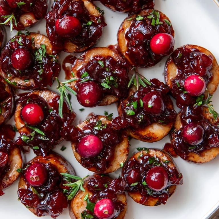 Save Savory sausage rounds topped with tangy cranberry sauce and fresh herbs, these festive bites are perfect for holiday gatherings and cocktail parties.