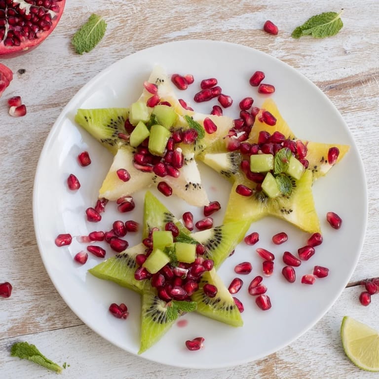 Save A vibrant, refreshing fruit platter featuring juicy pomegranate seeds and fresh mint, artfully arranged in a star pattern perfect for elegant brunches holiday tables or healthy snacking.