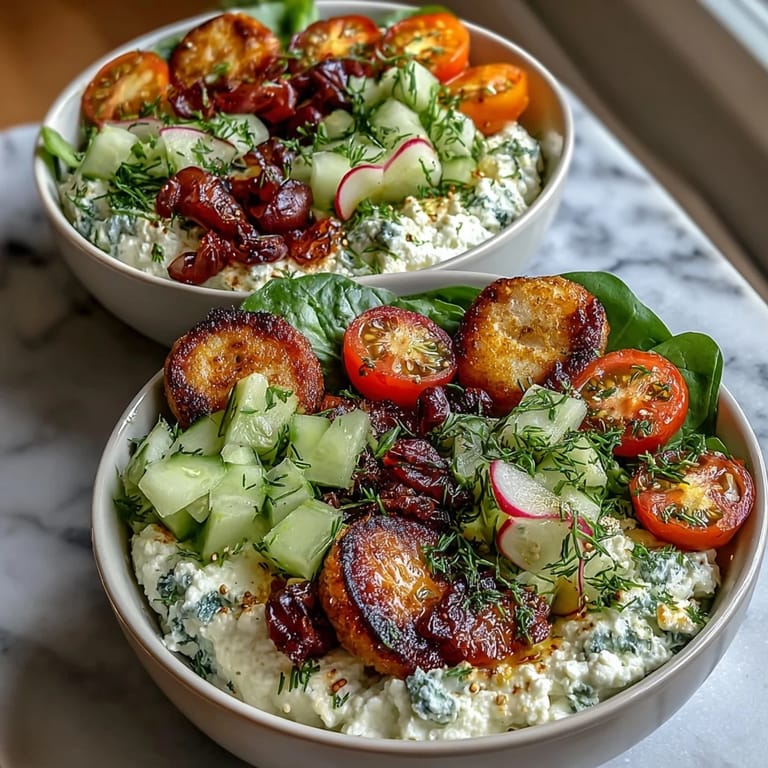 Save There's something about a bowl of cottage cheese that caught me off guard the first time I really paid attention to it. I'd been rushing through mornings, grabbing whatever was quickest, until a friend mentioned she'd started layering hers with vegetables and watching the whole thing transform into something that actually felt intentional. What struck me wasn't just how fast it came together, but how the creamy, tangy cheese became this perfect canvas for crisp cucumber, bright tomatoes, and fresh herbs. Now I can't imagine starting my day any other way.